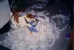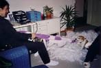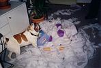 We had our rituals, me and Digger. In the morning he'd race into the living room as I walked from the kitchen, breakfast in hand, which I'd consume while watching the news on CNN. As soon as he saw me drain the last of the milk from the glass, he'd let me know it was time to go out NOW. He'd get a running start, leap up onto my lap or literally bounce off of my chest with his front feet, and plant his wet dog nose right on my nose during the bounce, or even give me a soft nip on the nose. I'd start giving a commentary as it it were a professional wrestling match - "owww, there's a lap crush", "whoaa, a stomach smash", "chest leap", "nose nab", and so on, with him getting more excited until he'd quit leaping and just stand there barking. Coming home was always an occasion for a dog greeting, although it was less tumultous with Digger than with both Shiva and Digger, who wound each other up. The sound of a rustling comforter would bring Digger from anywhere in the apartment rushing to the bed. He favorite sleeping place was on the comforter in the depression between the backs of my knees, and in the morning I'd find him on his back, all four feet sticking up. He got to fly back to the U.S. a couple of times, and also go on some trips to Milan, where he occasionally managed to catch a lizard sunning itself on the sidewalk where my cousins lived. I tried to take him with me wherever I could. He will be sorely missed. Back to Digger's main page