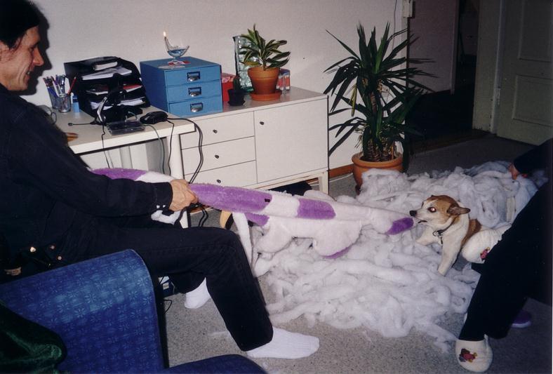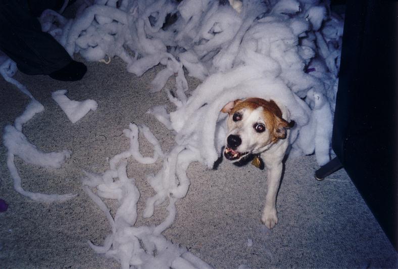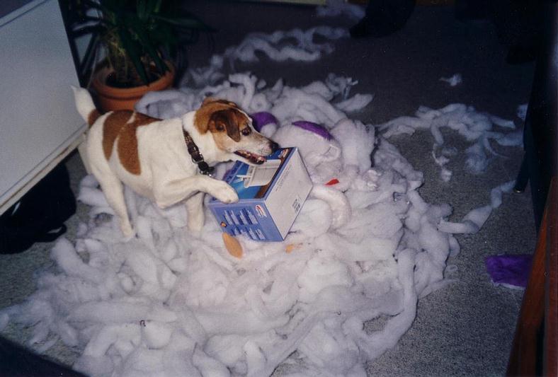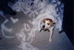 Digger was beloved by all who knew him. He brought a smile to everyone who saw him strutting down the sidewalk with his tennis ball in his mouth. He entertained many people by leaping into the air, flying in a meters long arc into the Glatt river, or by swimming out into Lake Zurich to retrieve it. Like most Jack Russell Terriers, he wasn't afraid of bigger dogs, especially ones which he suspected might be thinking of trying to steal his ball, and he regularly growled at or leaped into the face of German Shepards or other dogs who got too close to it. He had a terror of cow mooing sounds, which I thinked dated from a mountain hike where the path went through a hillside farm and he had to go past some cows which gave him mean looks in addition to mooing. From that day on, a Milka commercial on TV, or even a truck horn which sounds like a moo, would wake him from a comfortable snooze on the sofa and send him wild-eyed scurrying to the other end of the apartment. Sheep were apparently a different matter, as on another hike he stampeded some sheep into trampling down the fence and running all over, causing the irriated fellow hikers to have to round up the sheep and repair the fence. He had his friends and enemies in the dog world. His most recent friends were two small white poodles, along with any female in heat. His arch-enemy was "the red dog". The red dog was about three times his size, red (of course) and aggressive. Digger ignored him at first, but the red dog - Timone - kept trying to impress upon Digger his dominance, and one day Digger growled at him, which was enough provocation for an attack. I grabbed the red dog around his chest to pick him up to get him off of Digger, and when I did, Digger leaped up and got ahold of one of his forelegs and held on. As anyone who has seen me pick up a tennis ball with Digger attached to it - hanging only by his teeth and jerking around wildly - will know, he can hold onto something tenaciously. Since my hands were full of snarling red dog, it was left to the other dog's owner to get ahold of Digger and pull him off. In the meantime, the red dog starting yelping from the leg bite he was getting. Like any big bully who has been shown to be a crybaby by someone standing up to him, the red dog from that point on had an abiding hatred of Digger and a desire for revenge. The leg was uninjured, but the red dog had been humiliated. One dog which almost killed him was a white Pit Bull Terrier. These dogs should never have been bred, and I would be happy to see the breed made extinct. The Pit Bull attacked from a distance, with little or no provocation, not more than a growl from Digger at most, and got him by the throat and held on. The Pit Bull's teeth missed Digger's windpipe by a millimeter, else it would have been crushed. Pit Bull's don't just merely hang on though, they keep trying to get more throat in their mouth if they can. So it was thanks to me that Digger lived, because while the person walking the Pit Bull (not the owner) was uselessly beating on the dog, I got the fingers of both hands inside his mouth and slowly pulled his jaw open enough to let Digger escape. It wasn't easy. It took all my strength, and I cut my fingers on his teeth, and it took about 30 seconds of continuous pulling to just get the grip to loosen. But it was possible. I talked to the owner later, recommended a muzzle, and the owner just wouldn't hear of it - couldn't let his dog be defenseless against attacks from other dogs - regardless of the fact that other breeds hardly ever attack, but this one often does, and attacks from other normal dogs would only result in a bite wound. Later it attacked one of HIS other dogs, so he had to have it put to sleep. Some kind of justice. One could say that Digger - along with Shiva - learned to swim by watching other dogs frolicking in the river when I lived in Zofingen. It looked like such fun that they jumped into the cold rushing water as well, in the shallow rapids area where the dogs liked to play. He was a strong swimmer, and if he hadn't been, he wouldn't have been around so long. On the other hand, if he hadn't liked water, he wouldn't have gotten us both almost killed. He dropped his ball and it rolled down the river bank just upstream of an artifical waterfall, presumably made to control the flow of the river or prevent erosion, or maybe even to aerate the water, I don't know. It was, in any case, a deathtrap. Water on the surface downstream of a waterfall is pulled by the waterjet back upstream into the waterfall. Only on the bottom does the water travel downstream. This makes it difficult or impossible to swim away from a waterfall. Further, the currents and strong eddies underneath the surface tend to jerk things down and throw them around. Of course Digger jumped in to get his ball and when I saw that, I jumped right after him knowing that he was going to go over the falls. We both went over and when I came up, sure enough I got ahold of his collar and got over to the side. Unfortunately, the Swiss engineers had lined the river with smooth vertical concrete walls, many meters high and long, and there was no handhold at all. Digger and I were dragged backed into the waterfall, and I had to let go of him when I was suddenly pulled under. One second I had my head out of the water, and the next second I was looking up at the dark reflective surface about a meter over my head. I went through many cycles of popping up a couple of meters away, snapping some air, and being dragged back down again. Being fully clothed was a big hindrance. The water was cold, which sapped my strength. I got out, by the grace of God, only a minute before my strength would have given out and I would have drowned, by holding my breath, curling up into a ball, and letting the waterfall push me as deep as possible toward the bottom, where the current was flowing more strongly downstream. I said a little prayer down there, not knowing if my breath 